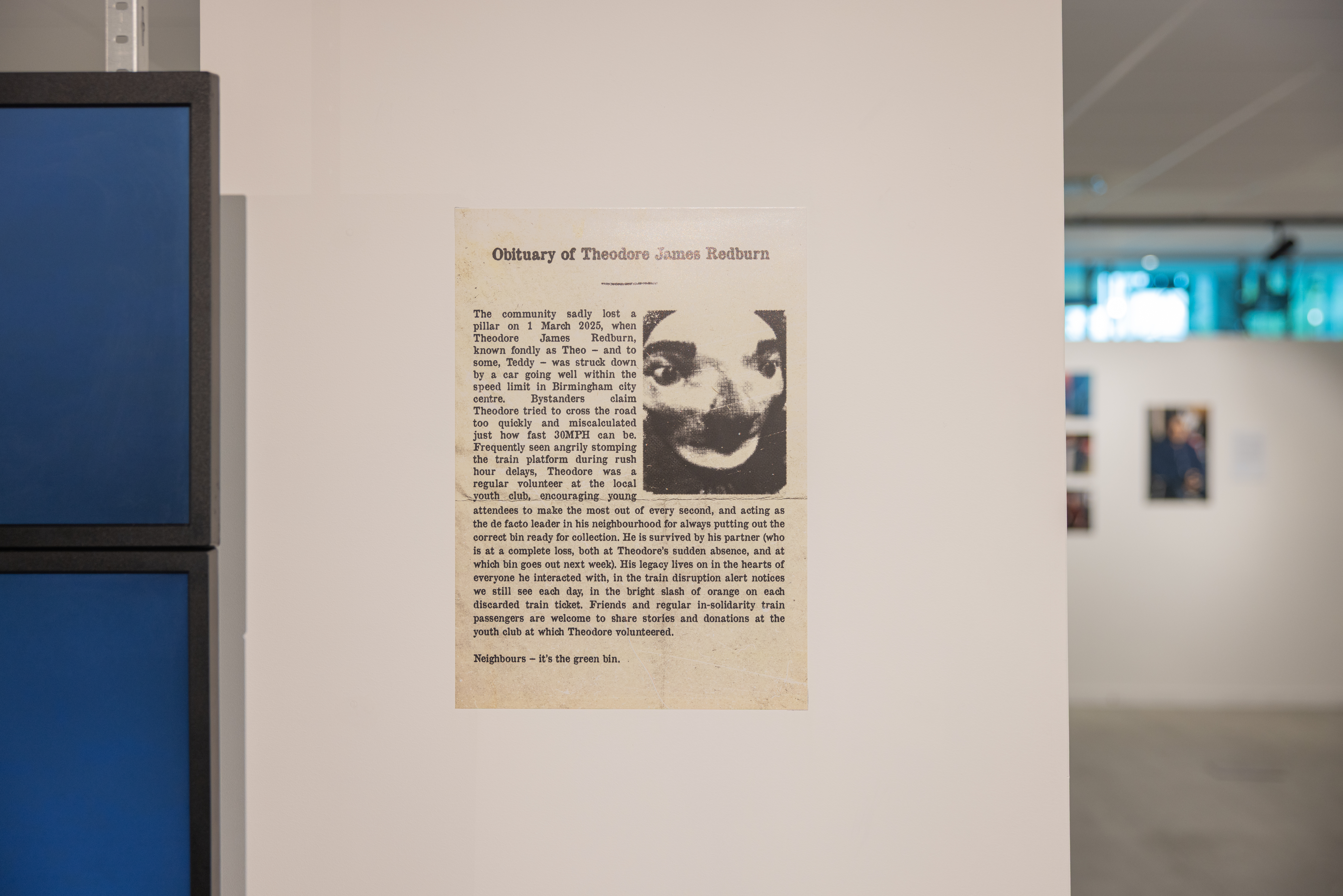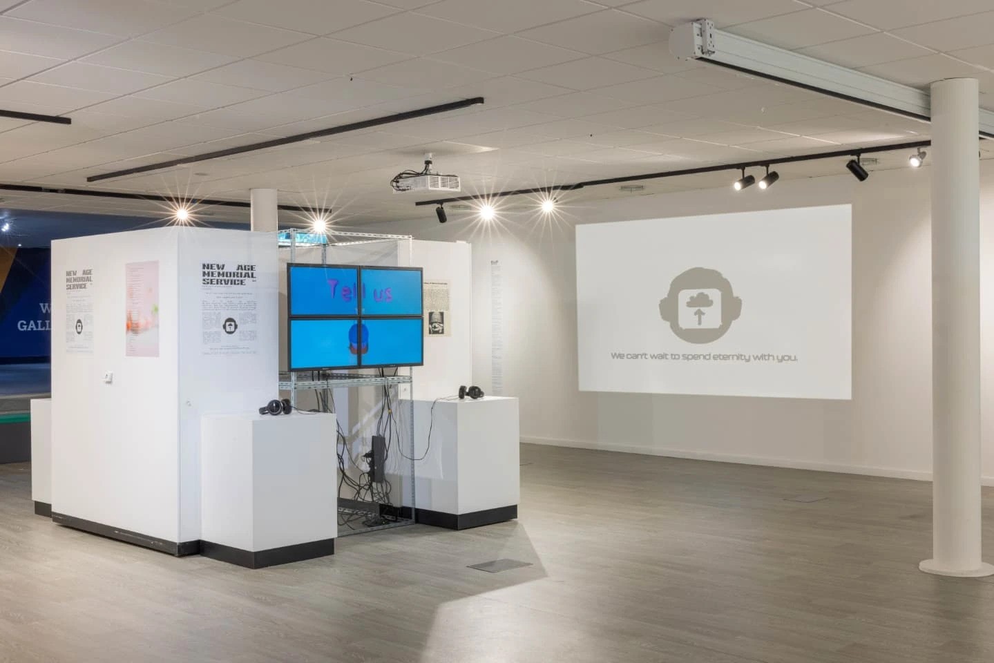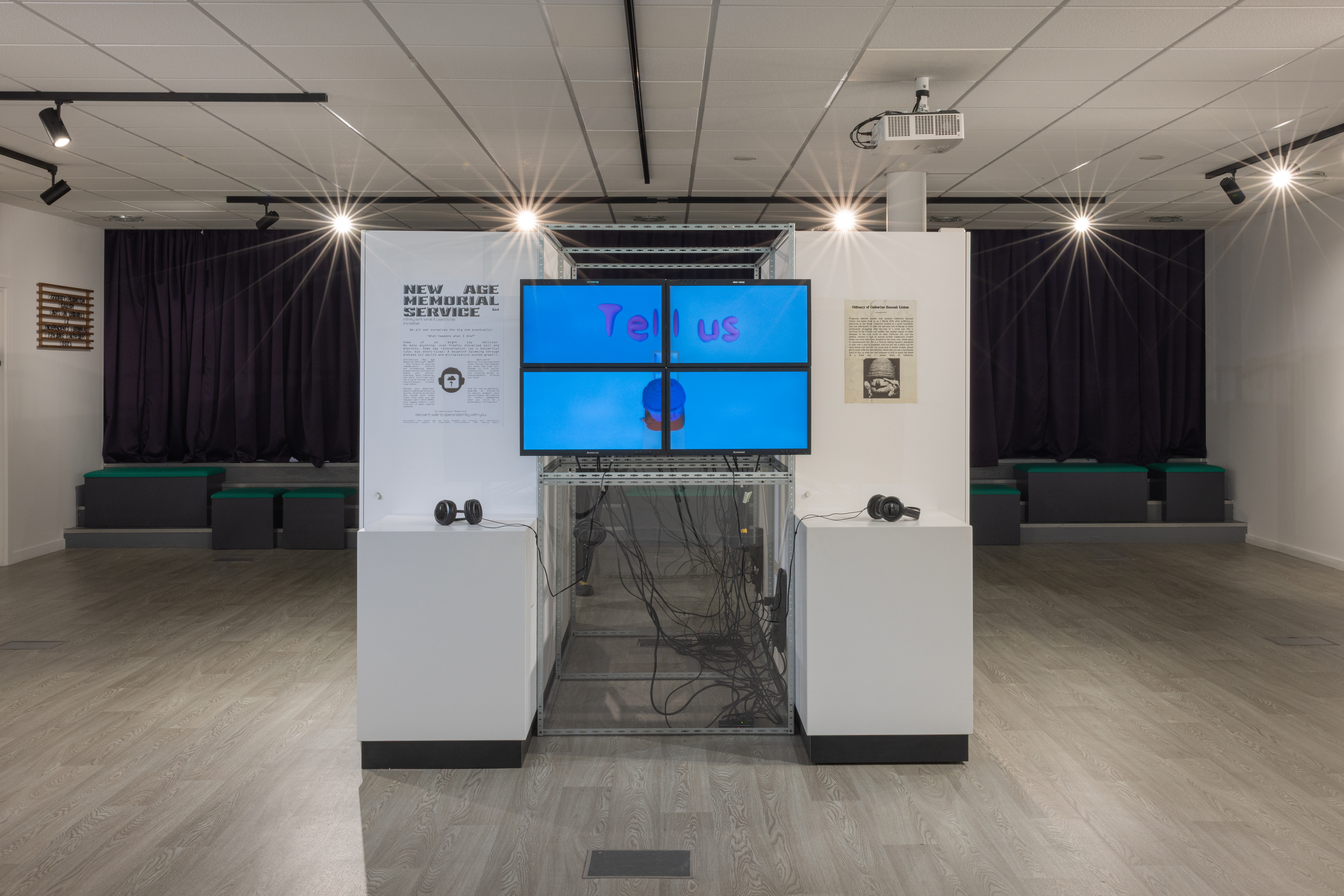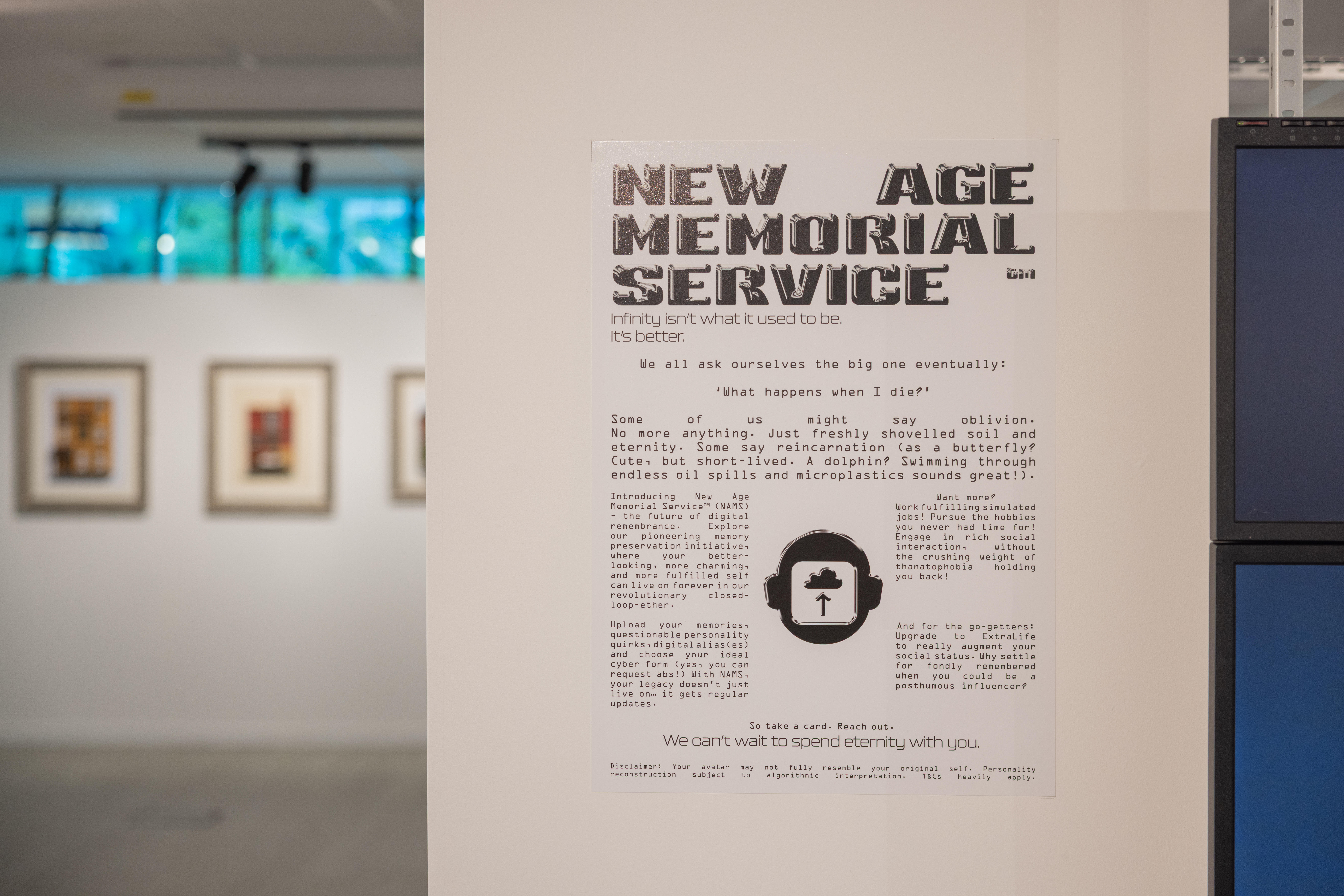 Verkade and Waldron-Hall’s installation playfully investigates ideas of digital personae, legacy, fear and consumerism within an imagined product – a purchasable digital afterlife – pushed by a sinister corporation.